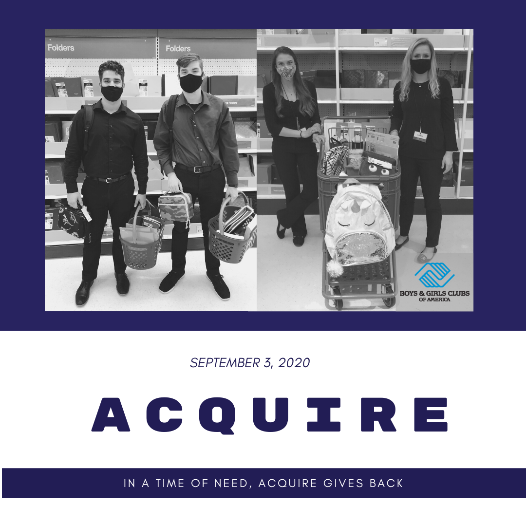 For the second year in a row, the Acquire team kicked off the beginning of the 2020-2021 year by donating school supplies and backpacks to the Boys and Girls Club...